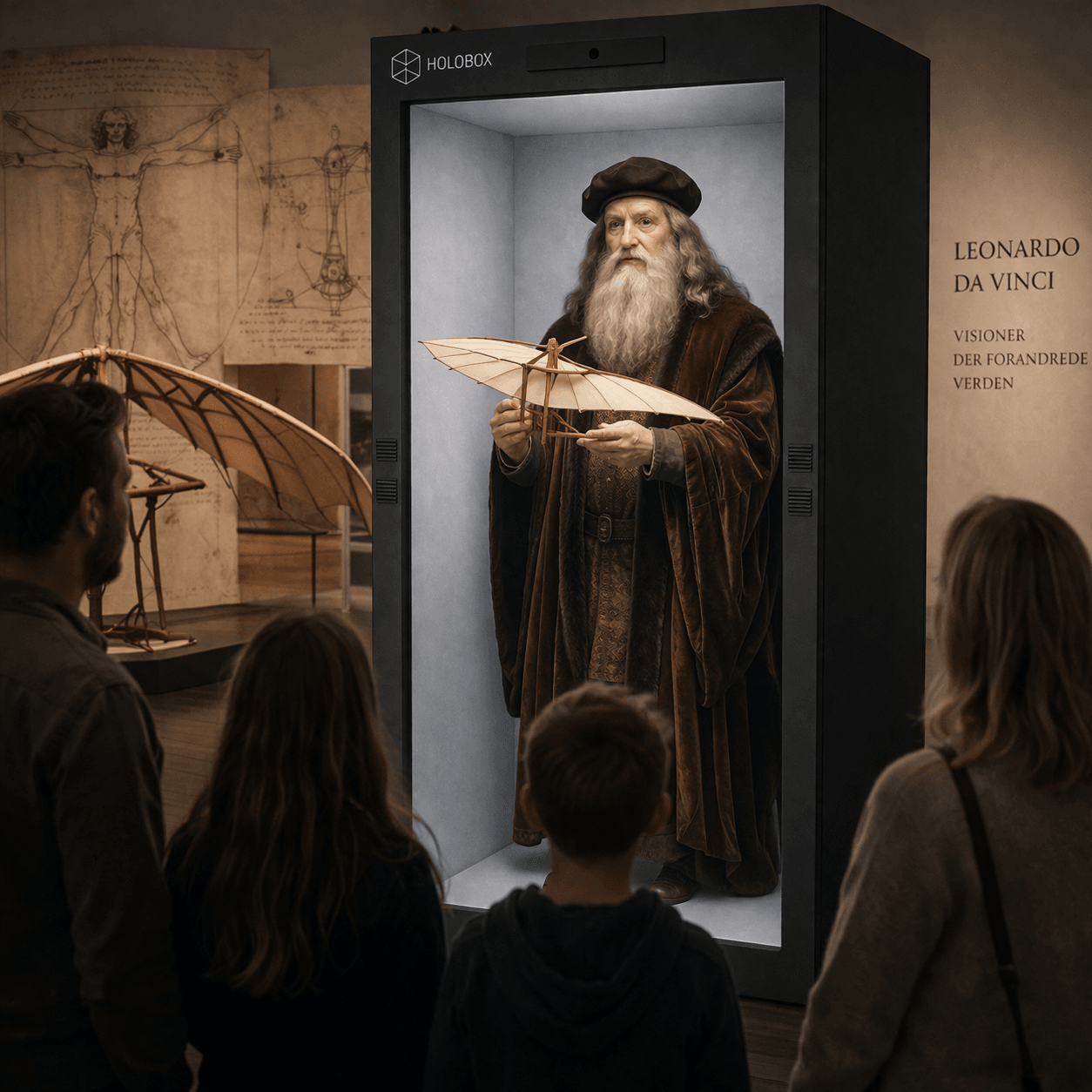Teknologien gør det muligt at blande virkelighed, fantasi og fortælling. Forestil dig en viking, der sidder og fortæller om livet til søs, en historisk opdagelsesrejsende der deler sine oplevelser, eller Leonardo da Vinci der forklarer sine tanker om flyvning og opfindelser. På samme måde kan en museumsinspektør, en butikschef eller en produktdesigner forklare et produkt eller en udstilling – som om personen står fysisk til stede.