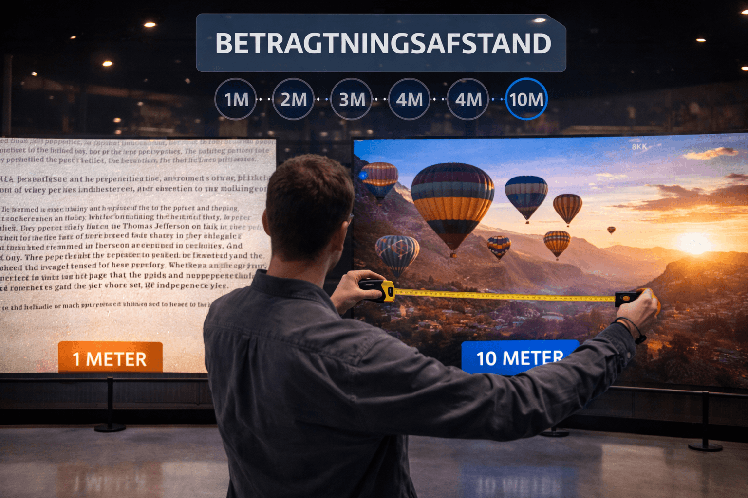 En skærm der ses tæt på skal gengive detaljer og tekst tydeligt, mens en skærm der opleves på afstand skal fremstå rolig og ensartet.