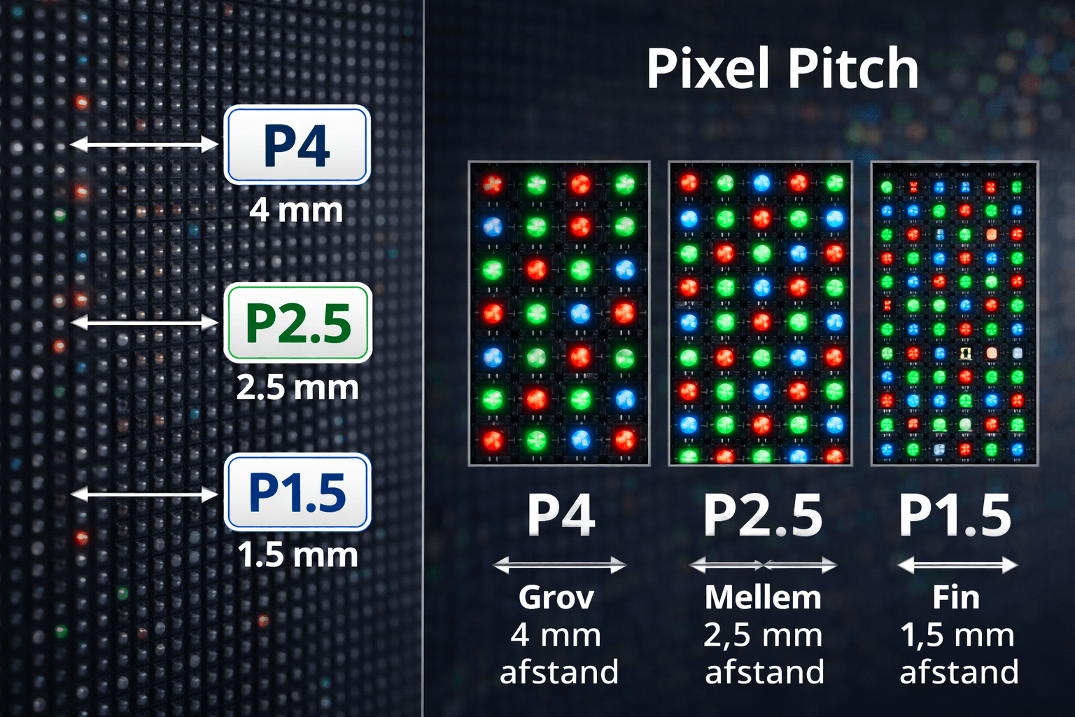 P-værdien (pixel pitch) fortæller, hvor tæt pixels sidder på panelet.